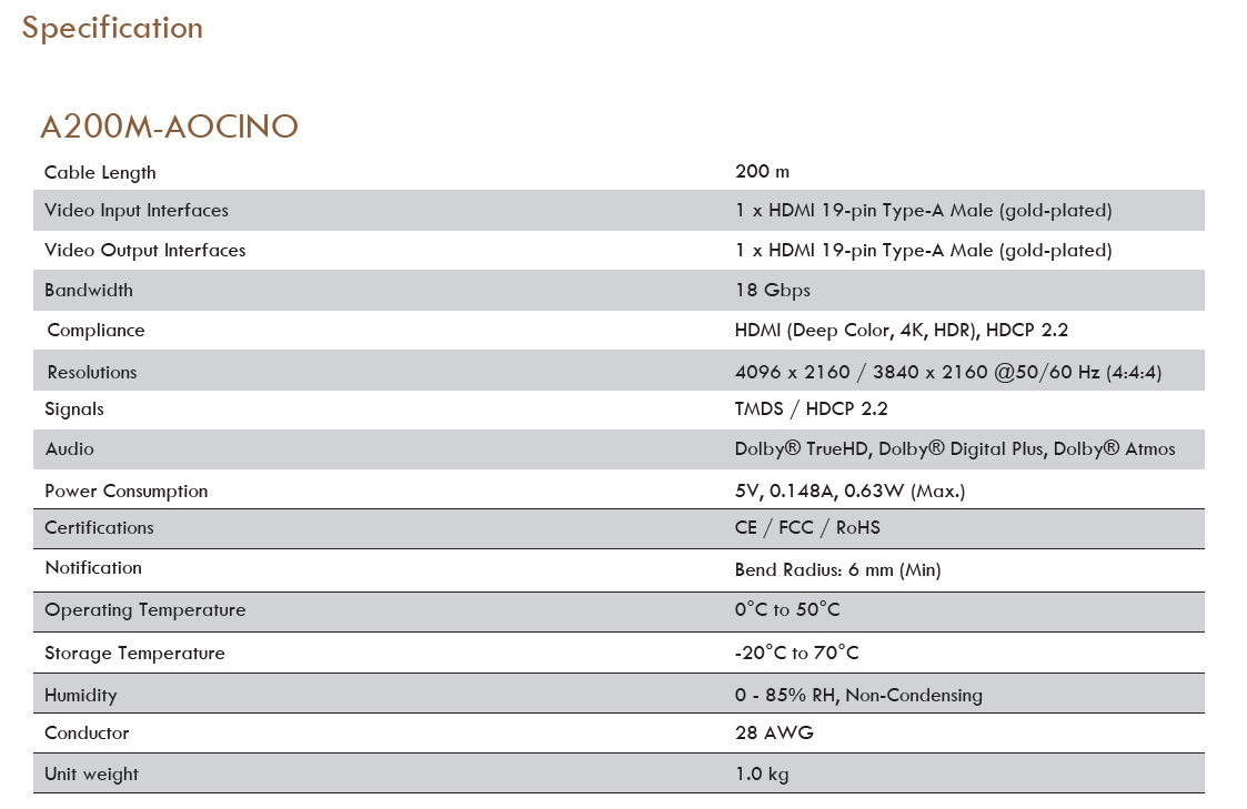 optical signals for optimum high bandwidth data transmissions. - The optical cable is available in 200 m with full support of 4K/UHD. It is fully compliant with HDCP 2.2 standards and meets HDMI, deep color, and 18 Gbps Bandwidth. Supported HDR10 and Dolby Vision. Support all digital audio Dolby TrueHD, Dolby Digital Plus, Dolby Atmos.