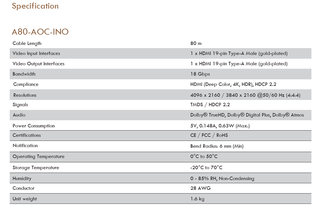 - Angustos A80-AOC-INO optical cable utilizes AOC (Active Optical Cable) technology that enables conversion between input signals and optical signals for optimum high bandwidth data transmissions.