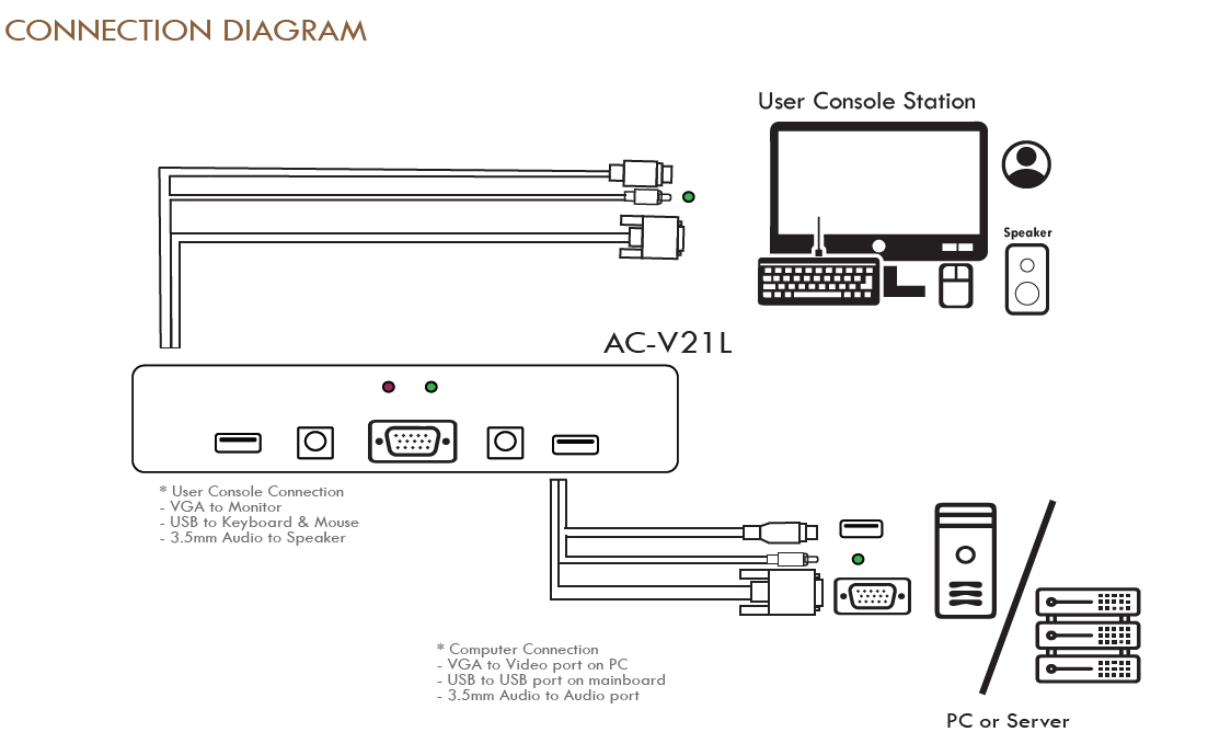 - A KVM Switch with 2 VGA and supports computers with USB interfaces via cables. All packed in a small size desktop metal housing. The small size design ultilized for narrow space for personal or office / SOHO uses. The AD-V21L can control up to 02 computers.