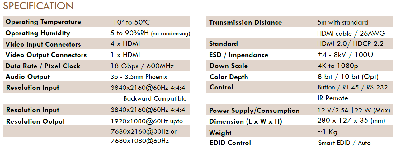 Output up to 7680 x 2160 @ 30Hz - IR support for remote control