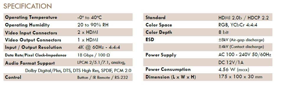 - HDMI 2.0b, HDCP 2.2 / HDCP 1.x