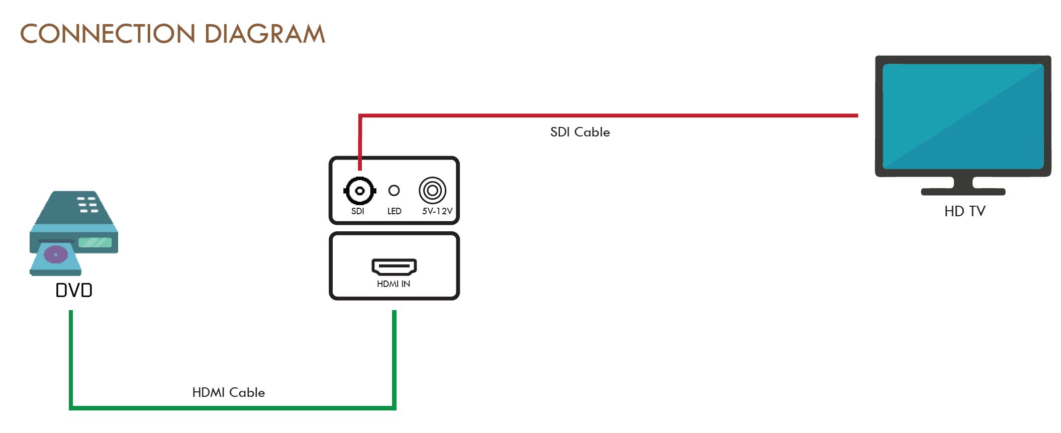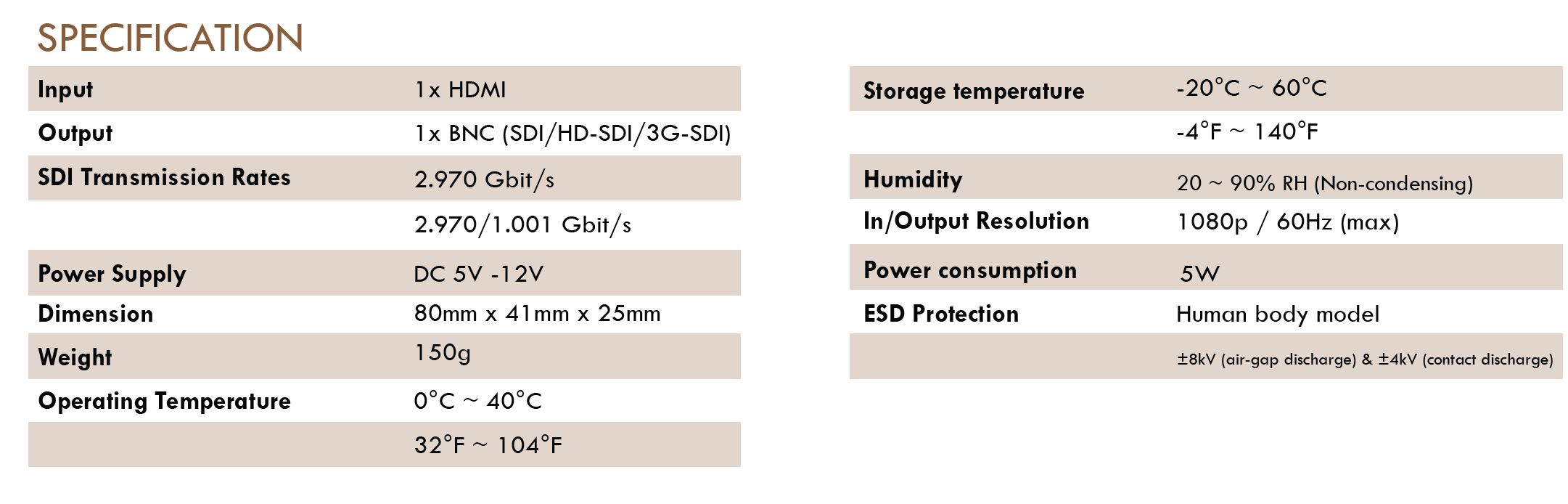 - Converts HDMI signal to SDI: 480i/576i to SD-SDI (SMPTE 259M-C, at bitrates of 270 Mbit/s).