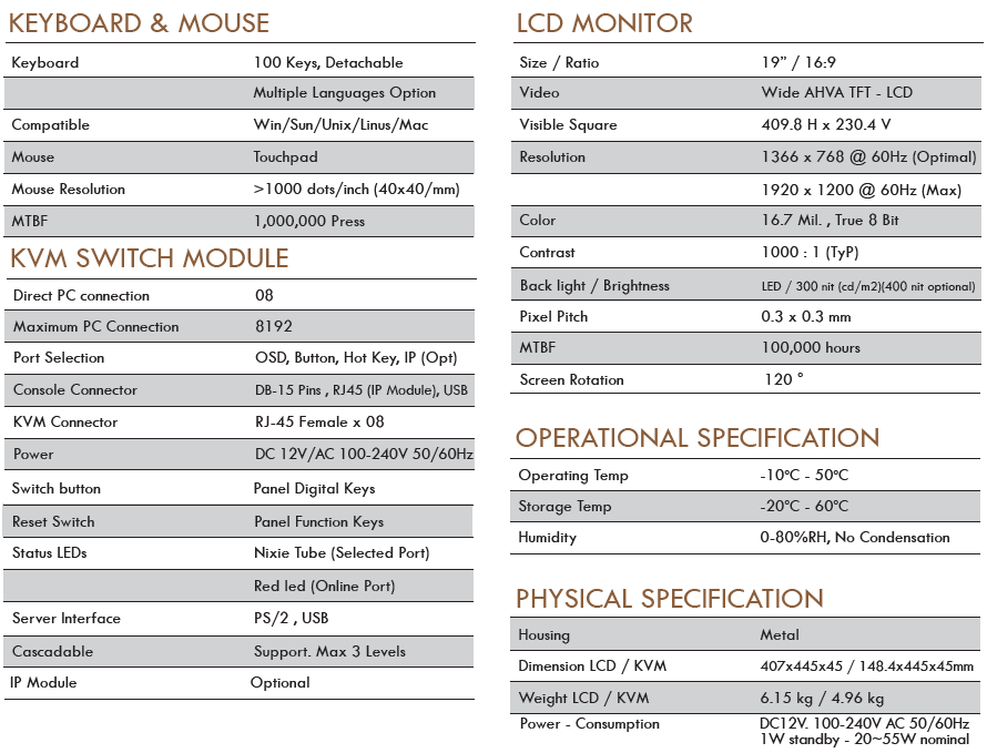 • LCD KVM console with an 19” LED-backlit 16:9 LCD monitor in a dual rail design.