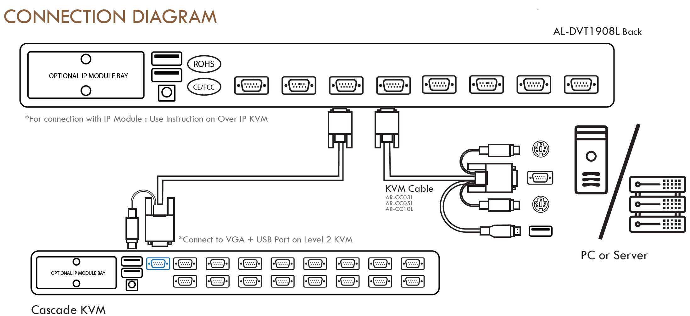 condensed area. The AL-DVT1908L can control up to 08 computers; with 08 additional KVM switches are cascaded, a single AL-DVT1908L LCD KVM Switch can control up to 8192 computers. - In addition, the AL-DVT1908L included an additional hot-pluggable USB port that supports other keyboard and mouse for back-up. With all of the technology involved, the AL-DVT1908L LCD KVM Switch has gone beyond the expectations and requirements for a modern Data Center use, which including : short space optimization, exceptional display quality, easy to install, extreme versatility.