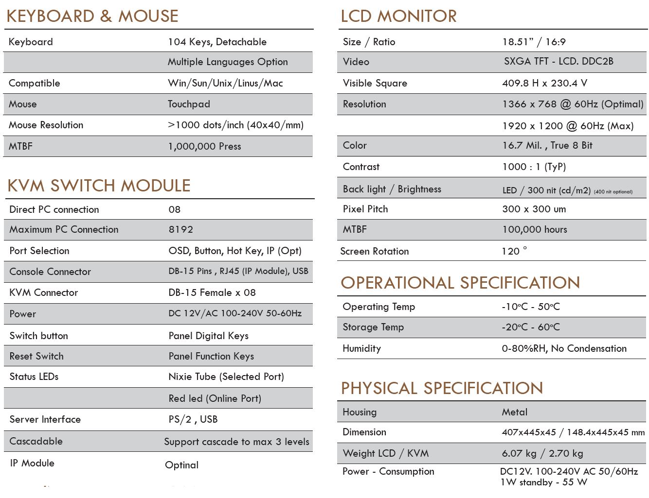 • Dual Rail design – Keyboard and Touchpad rail can be pushed back for space saving and using LCD screen for monitoring server information.