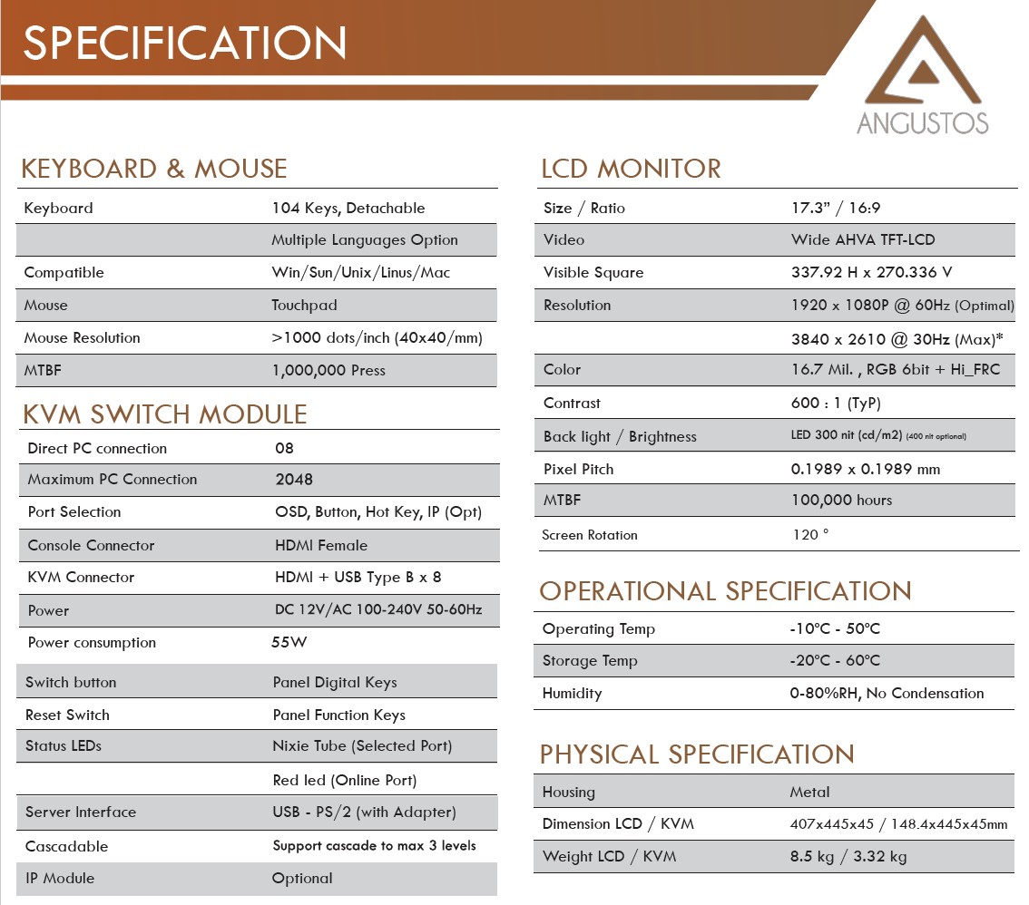 • Angustos AL-H708L LCD KVM Switch is optimized for high density Rack in modern Data Center. Supporting Full HD resolution for high end computers / servers.