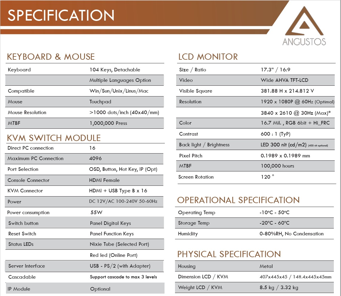 - Angustos AL-H716L LCD KVM Switch is optimized for high density Rack in modern Data Center. Supporting Full HD resolution for high end computers / servers.