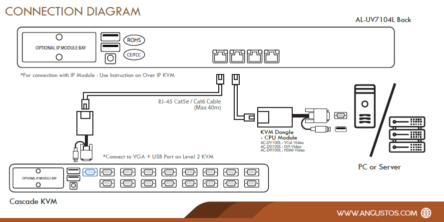 - Angustos AL-UV7104L – 17″ LED Display KVM Switch is optimized for high density Rack in Server rooms or modern Data Center. Integrating a 17” LED screen, keyboard and mouse pad in a 1U rackmountable sliding housing. The short-depth design utilized for narrow space for short-rack mounting in condensed area. The AL-UV7104L can control up to 4 computers; 2 Levels Cascade control up to 64 computers from a single console.