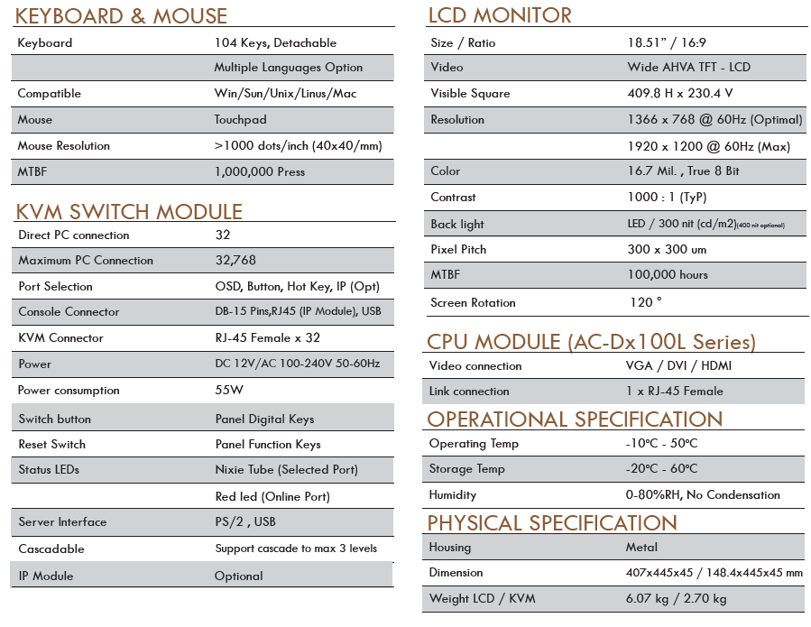 • LCD KVM console with an 18.51” LED-backlit wide 16:9 LCD monitor in a single rail design.