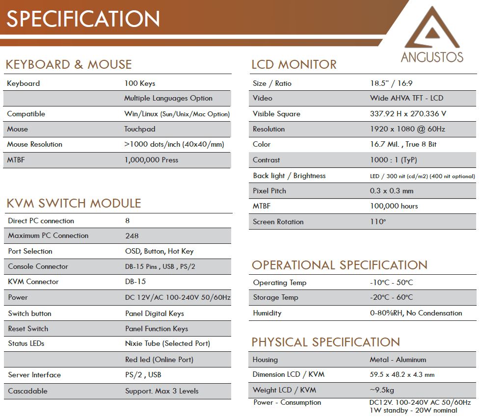 • Angustos AL-V18508FD LCD KVM Console Drawer is optimized for high density Rack in modern Data Center.