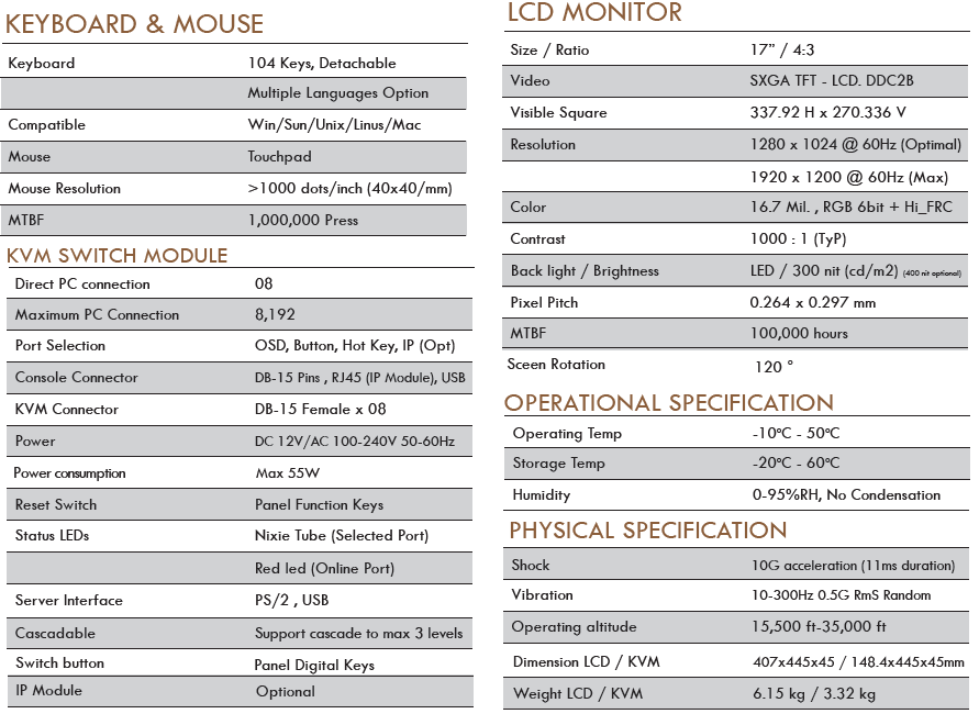 • LCD KVM console with an 17” LED-backlit 4:3 LCD monitor in a single rail design.