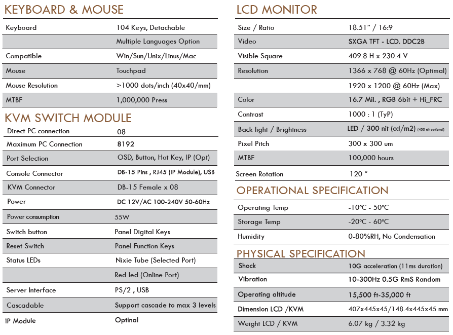 • LCD KVM console with an 18.51” LED-backlit wide 16:9 LCD monitor in a single rail design.