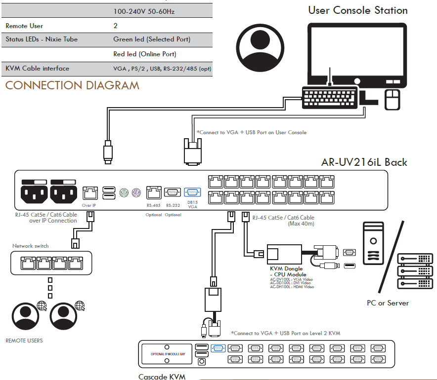 - The short-depth design ultilized for narrow space for short-rack mounting in condensed area. The AR-UV216iL can control up to 16 computers; with 16 additional KVM switches are cascaded, a single AR-UV216iL KVM Switch can control up to 128 computers.