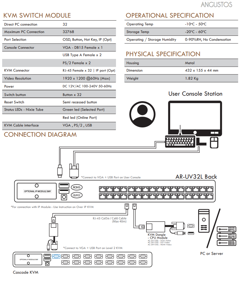 - Angustos AR-UV32L Rackmount KVM Switch is optimized for high density Rack in modern Data Center.